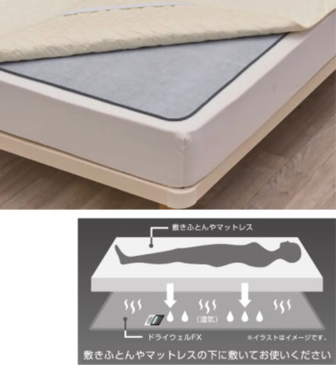 西川の吸湿ドライシート【ドライウェル】を敷布団やマットレスの下に敷くだけです。