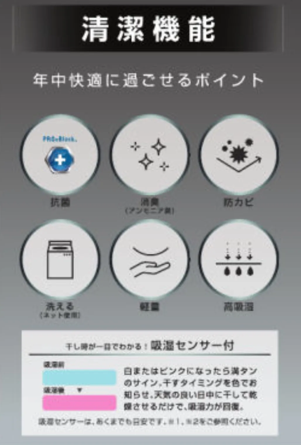吸湿センサーが付いており、ピンクになったら満タンで吸水性が落ちるので晴れた日に天日干しをすれば繰り返し使えてエコです。