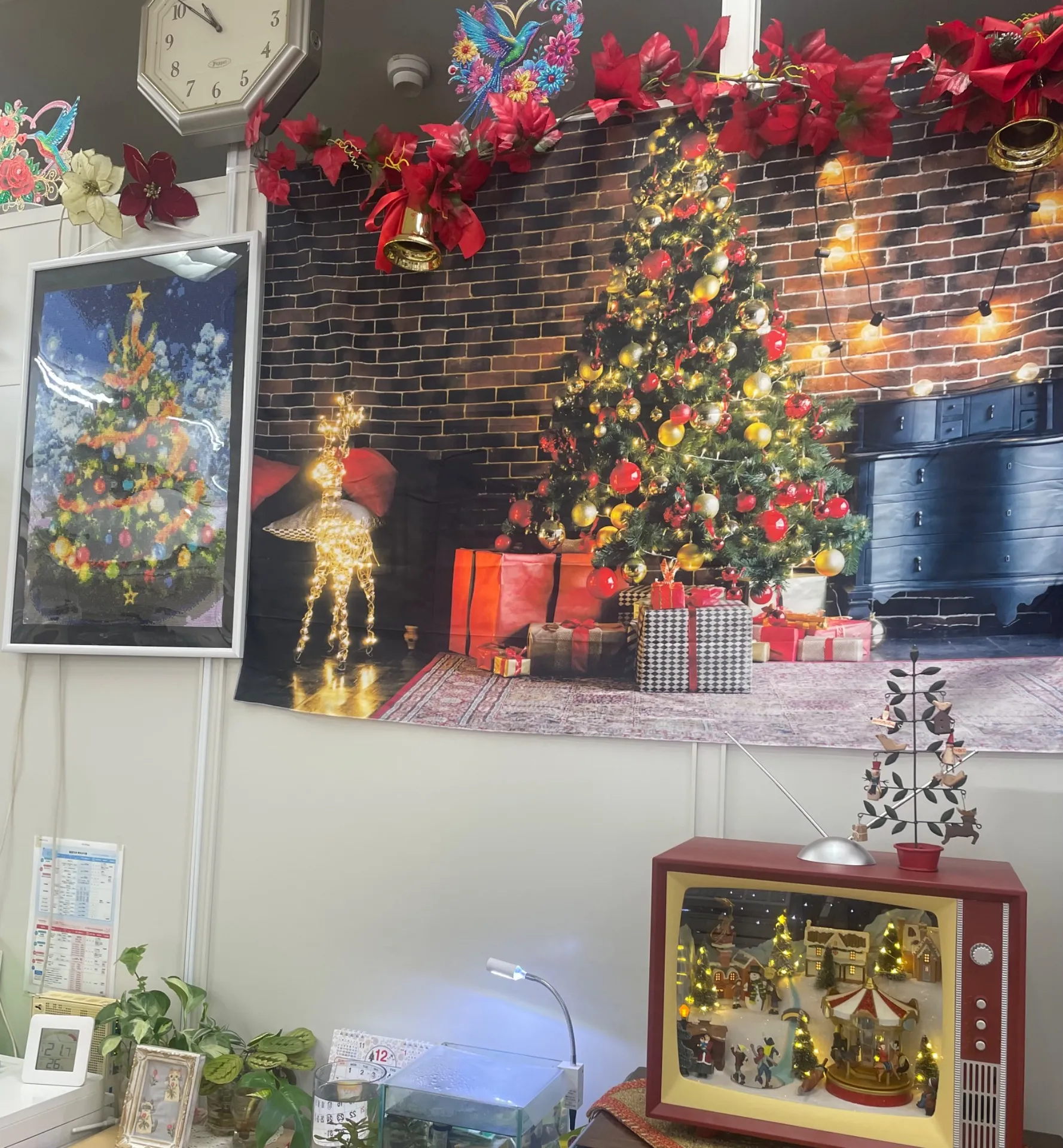 当店の『手芸部』(月2回店内で開催しています。只今部員私含め5名ほど)で作成したミニツリーやリース、クリスマスツリーのダイヤモンドアートなどをレジ裏壁面にこれでもか!と配置し、クリスマス圧が凄いです!改めて見てみると引くレベルですw